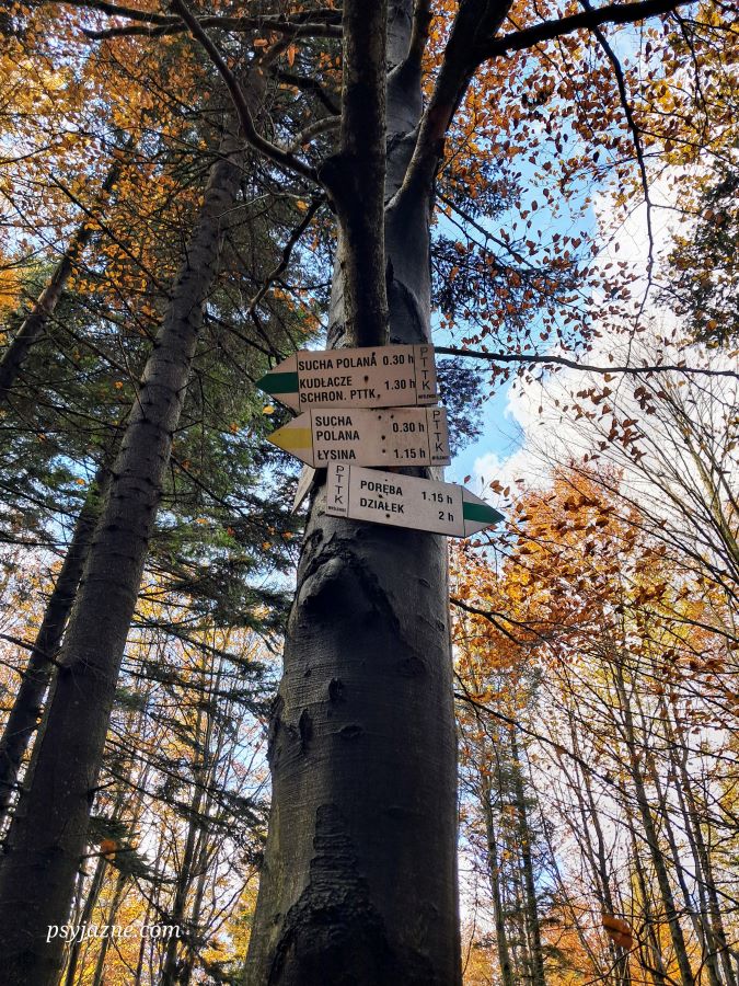 Około 400 m przed Kudłaczami zielony szlak łączy się z czerwonym, tak dobrze nam znanym, gdy wędrowaliśmy nim razem z Hugo kilka miesięcy wcześniej z Bielska-Białej Straconki na Luboń Wielki (Mały Szlak Beskidzki z psem).