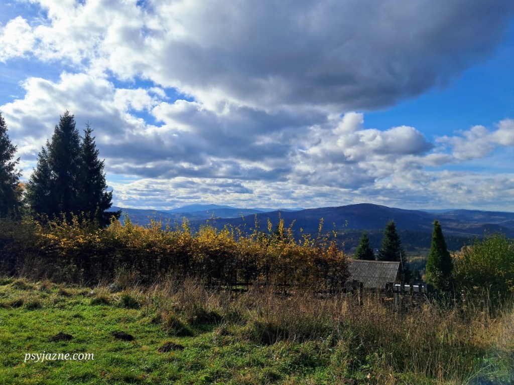 Przechodzimy na drugi koniec polany, skąd rozpościera się widok na pasma Beskidu Żywieckiego, w tym Pasmo Babiogórskie.