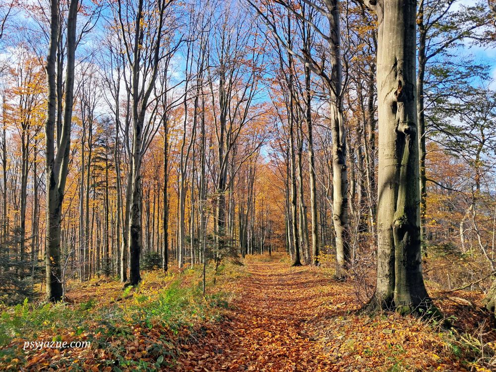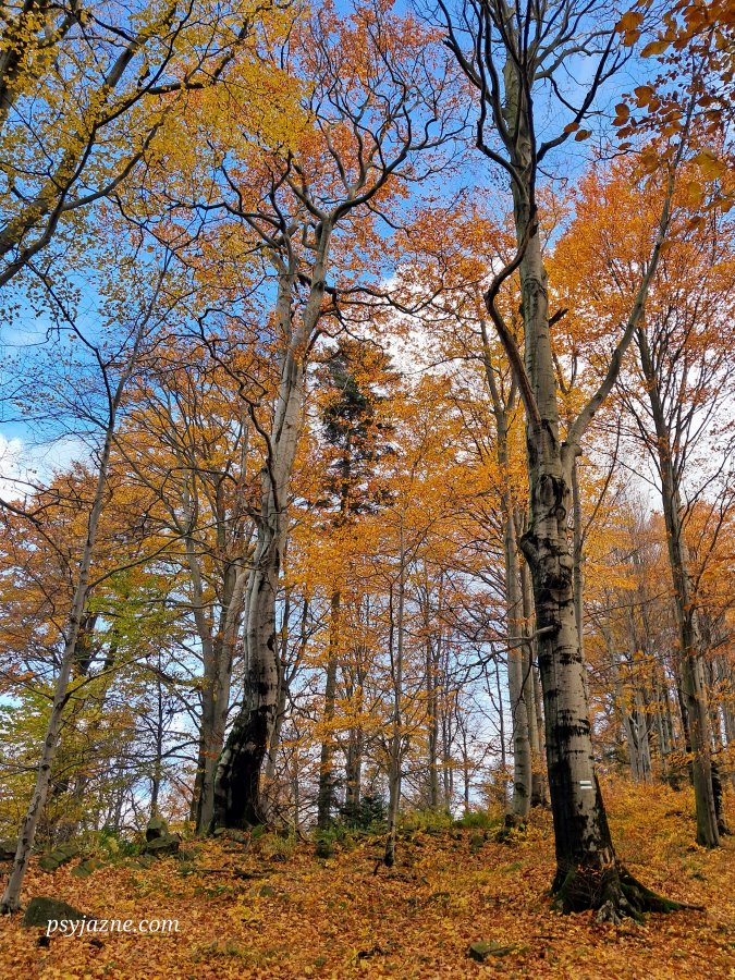 Jeszcze parę kroków i zanurzamy się w jesienną buczynę, która wita nas kobiercem utkanym z kolorowych liści.