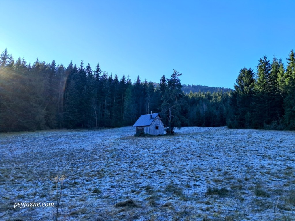 Po przejściu ok. 1300 m od przełęczy i prawie niezauważalnym podejściu, znajduję się na skraju bezimiennej polany z szałasem i informacją o terenie prywatnym. Północny stok i poranny leciutki mrozik sprawiają, że miejsce jest prawie w całości zaszronione.