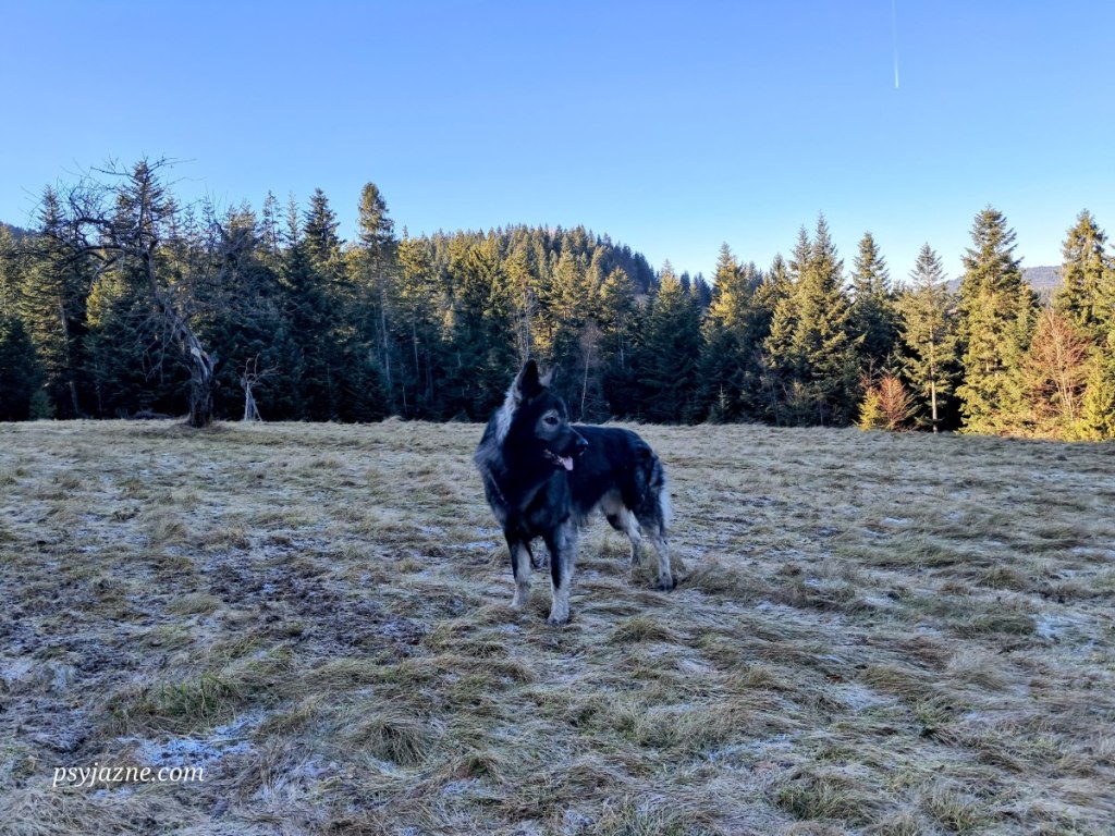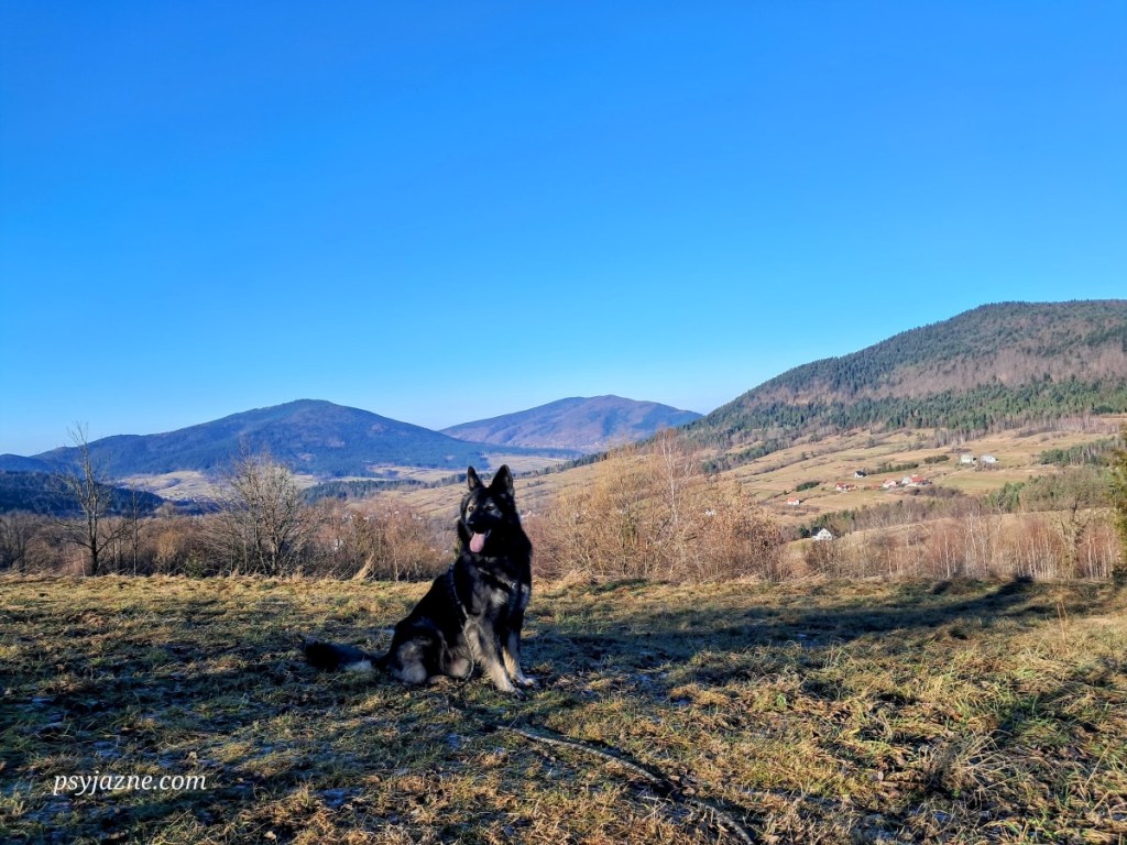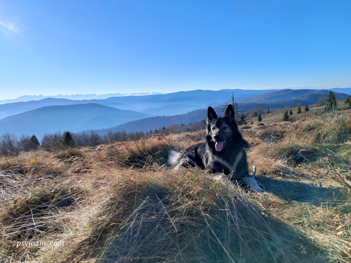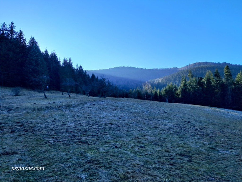 Pomimo faktu, że jest 19 grudnia na polanie nie ma krzty śniegu, a południowe słońce nagrzewa powietrze do 7-8oC. Rozsiadam się wygodnie wraz z Hugo, by w ciszy i samotności rozkoszować się otaczającymi nas widokami. Czuję się niczym podmiot liryczny Stepów Akermańskich „Wpłynąłem na suchego przestwór oceanu…” Uwielbiam ten stan🙂