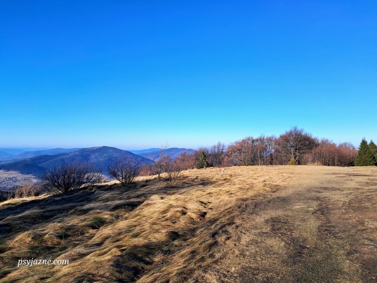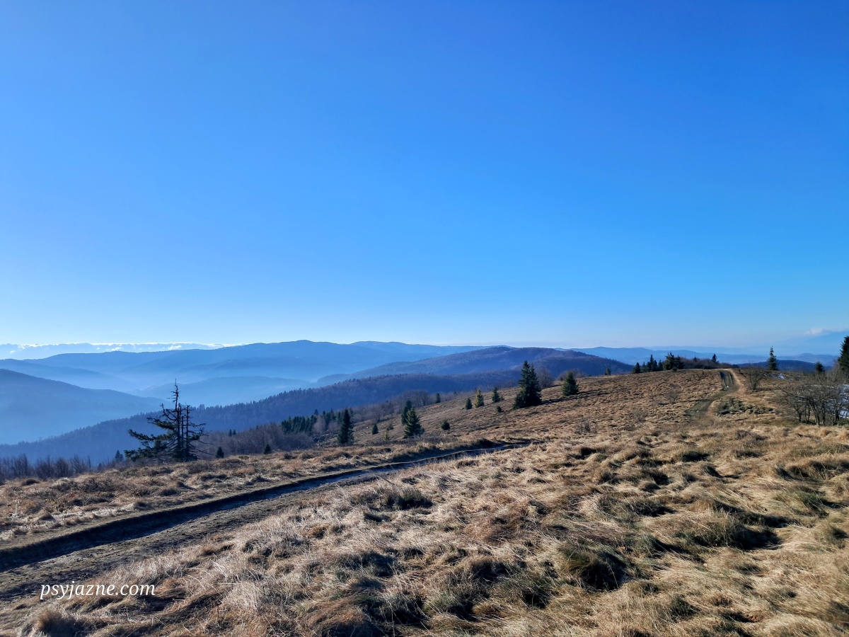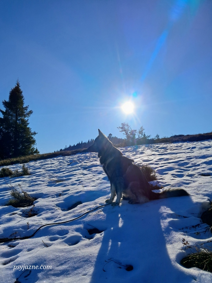 Pomimo faktu, że jest 19 grudnia na polanie nie ma krzty śniegu, a południowe słońce nagrzewa powietrze do 7-8oC. Rozsiadam się wygodnie wraz z Hugo, by w ciszy i samotności rozkoszować się otaczającymi nas widokami. Czuję się niczym podmiot liryczny Stepów Akermańskich „Wpłynąłem na suchego przestwór oceanu…” Uwielbiam ten stan🙂