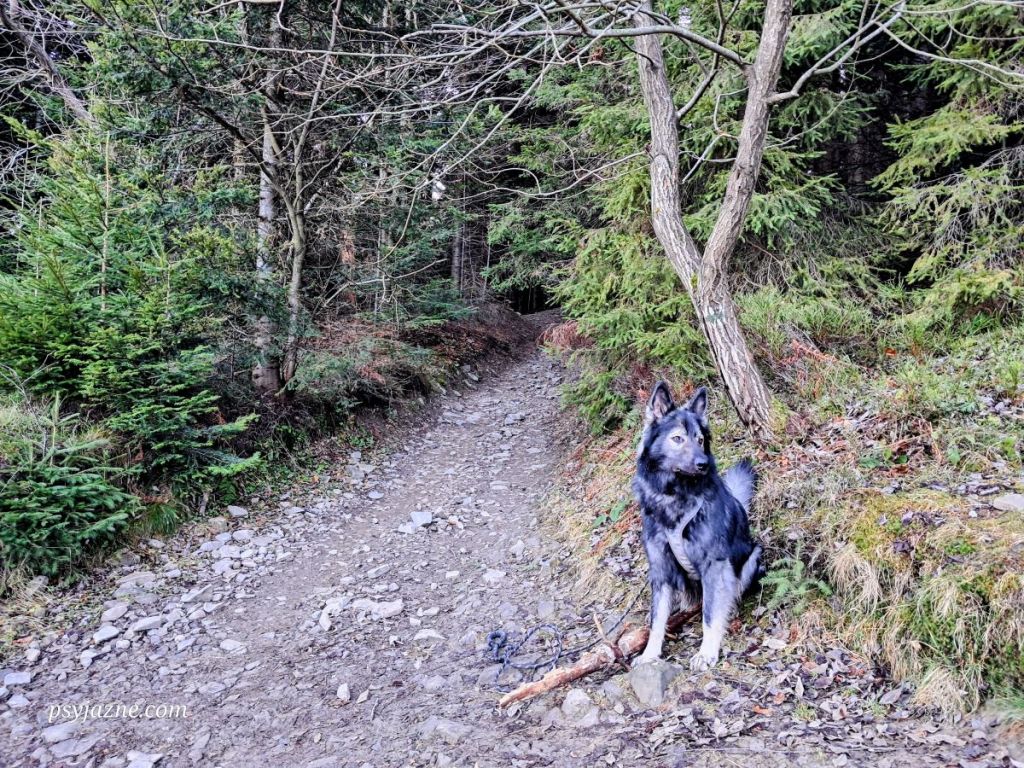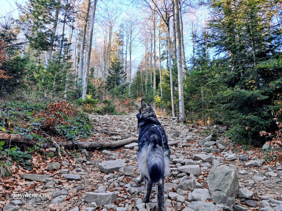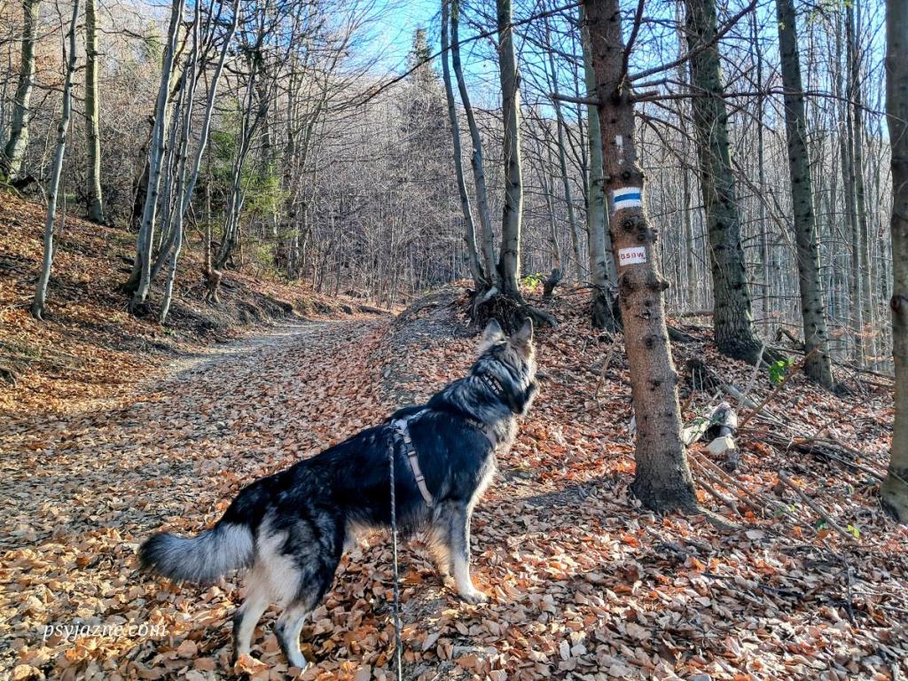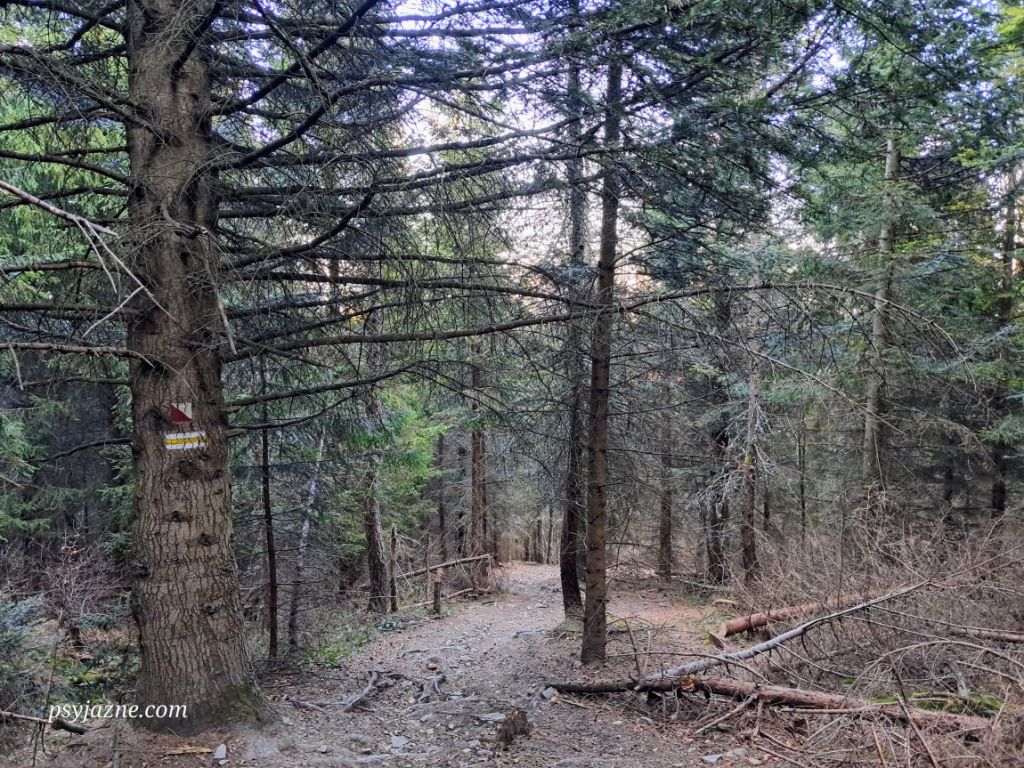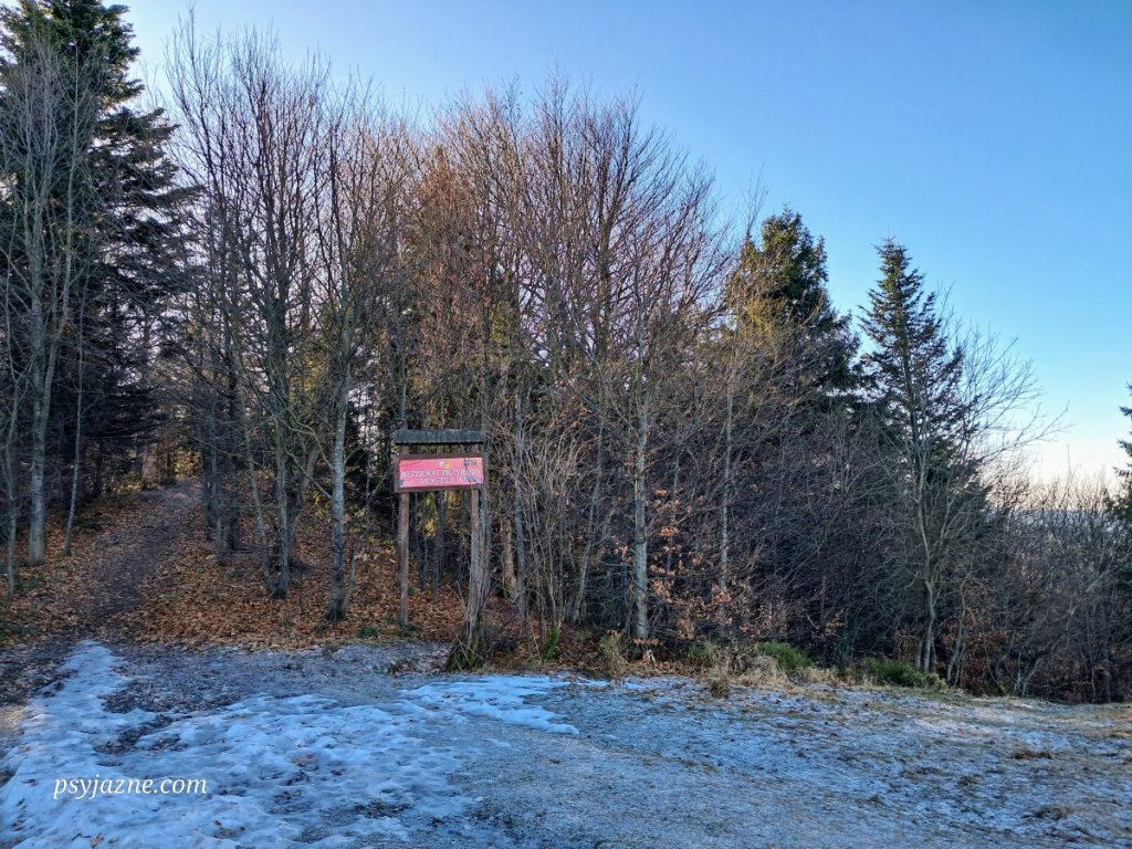 Z tego miejsca na szczyt i wieżę widokową jest już niespełna 0,5 km podążając dalej zielonym szlakiem. Ale nie dla mnie, gdy idę w psim towarzystwie. Dlatego wybieram ścieżynkę znajdującą się na prawo od tablicy, która prowadzi przez Wyśnikówkę do niebieskiego szlaku.