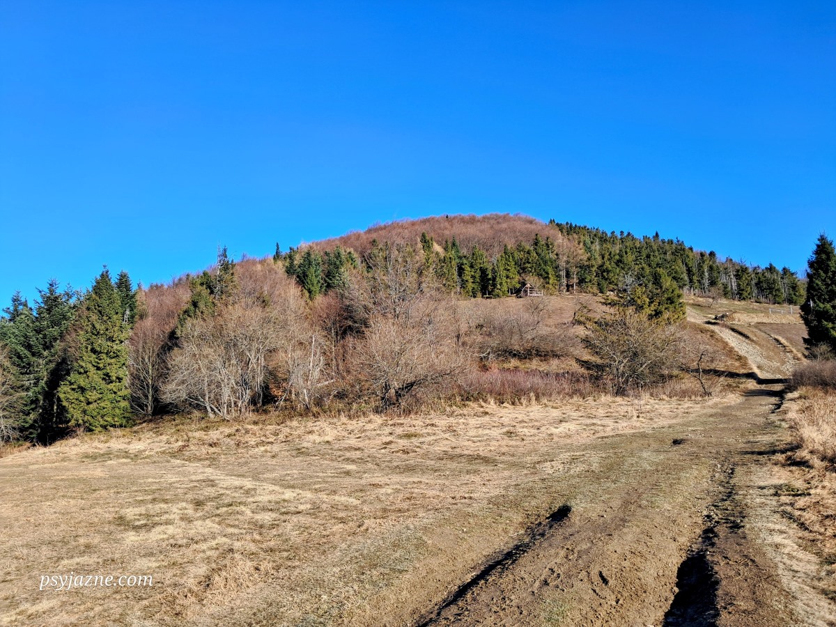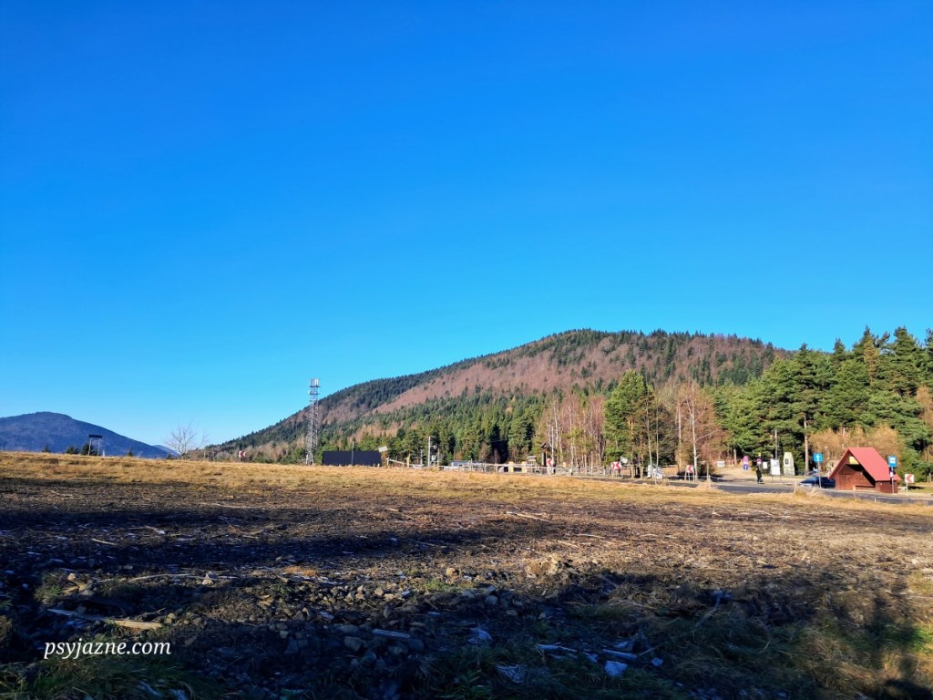 Po przejściu 1,5 km dość monotonnym odcinkiem, wychodzę na zaszronioną Polanę u Błazka, z której widoczny jest szczyt Mogielicy.