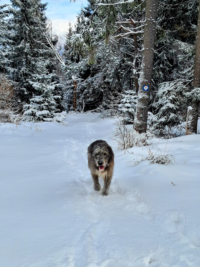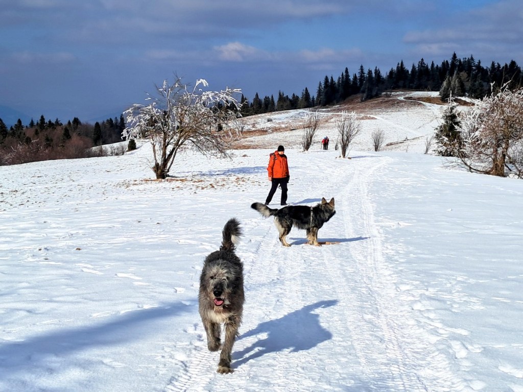 Naszym zadaniem jest regularne jego wyczesywanie, by zapobiec tworzeniu się kołtunów, a dla psiaków to dodatkowa forma „pieszczoty”, choć Lucky jest mniej skory do takowych. Czasem zdarza się, że musimy pomóc psom w wyciągnięciu kulek śniegu, które zbijają się na podeszwach, pomiędzy poduszeczkami, ale to też zdarza się sporadycznie. Największym zimowym problemem psich łapek, z którym na szczęście nie spotkamy się na górskich szlakach, jest dyskomfort, czy wręcz ból wywoływany przez sól drogową. Aby go zminimalizować nakładamy na poduszeczki naszych podopiecznych pokaźną warstwę wazeliny.