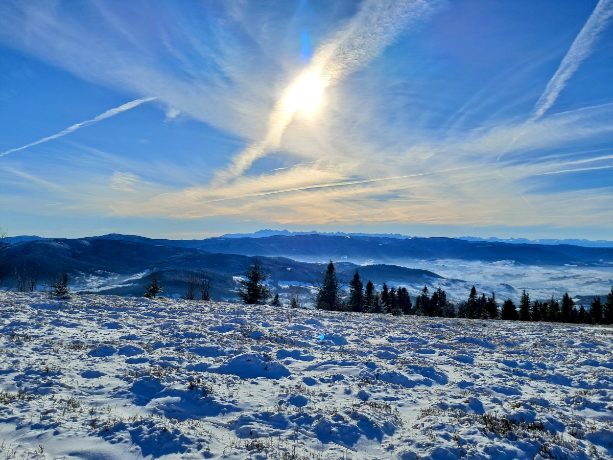 Poza wspomnianą przeze mnie sferą sacrum zimowej scenerii, jest jeszcze ta druga – bardziej przyziemna: chłód i krótki dzień. Z tego też powodu planuję wycieczki kilkukilometrowe, które możemy przejść w kilka godzin, w mniejszym lub większym blasku słońca, jak np. z Jurkowa na Ćwilin w Beskidzie Wyspowym,