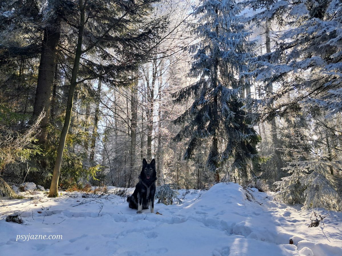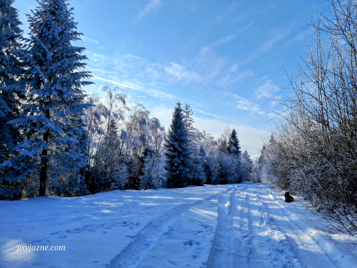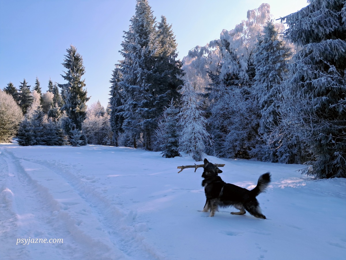 Mijamy kilka zabudowań, parę razy na rozgrzewkę rzucamy patykiem, po czym zanurzamy się w otchłań zimowego lasu. A ten wygląda po prostu obłędnie!