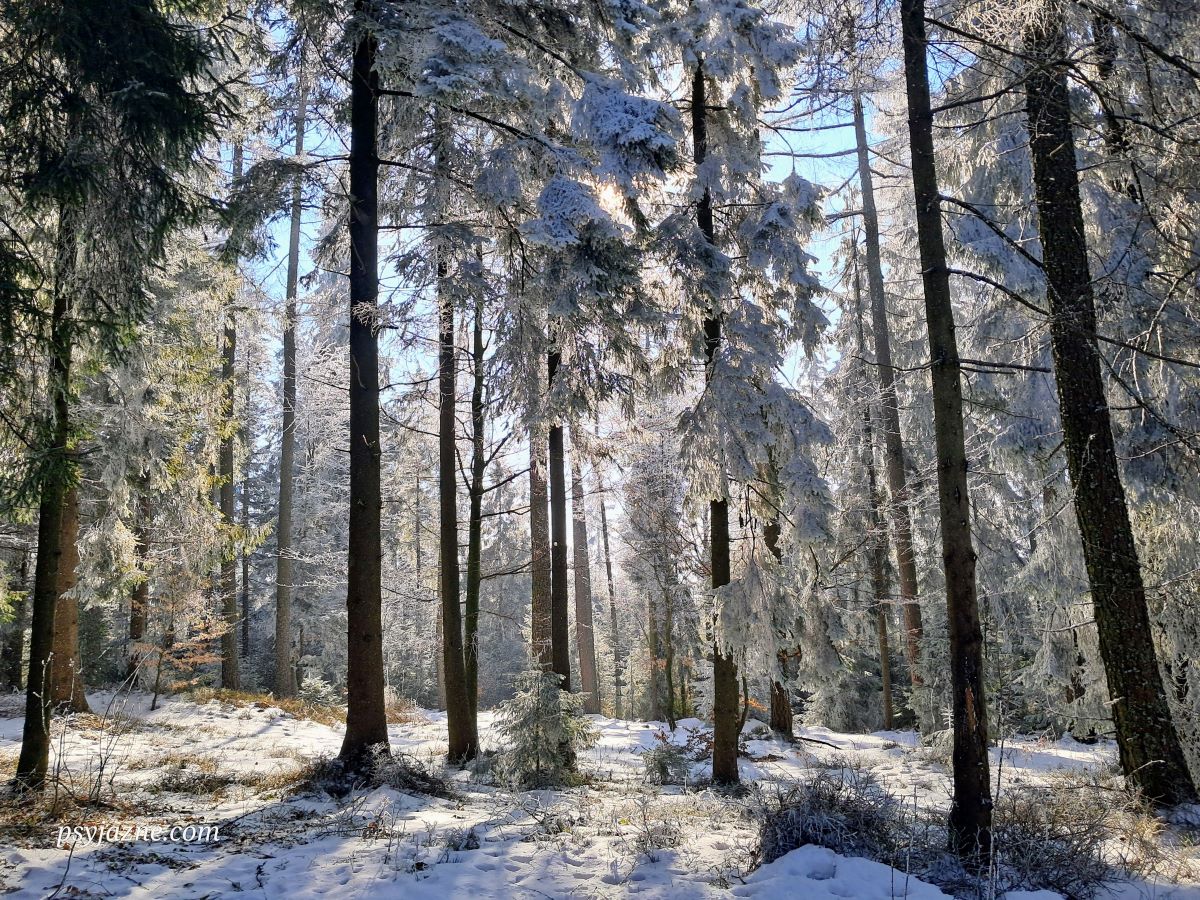 Luboń Mały (869 m n.p.m.) to mało wybitne wzniesienie w zachodnim grzbiecie Lubonia Wielkiego, w całości zalesione, a co za tym idzie – pozbawione widoków. Te rekompensują dzisiaj ośnieżone drzewa i baraszkujące w promieniach słońca płatki śniegu,