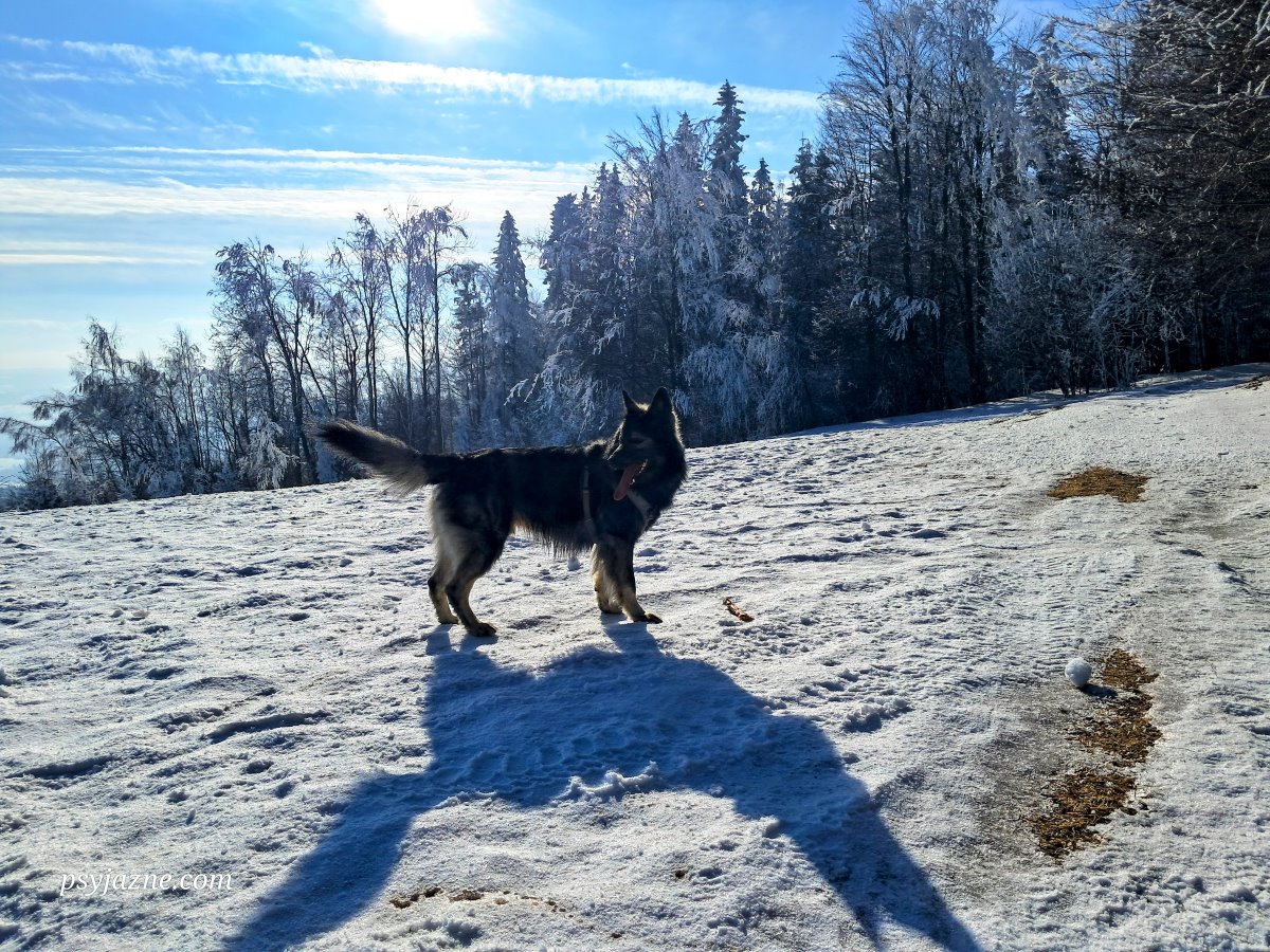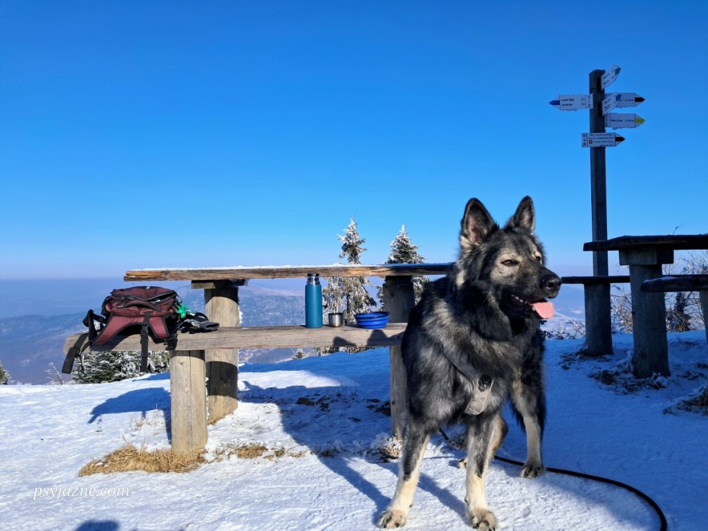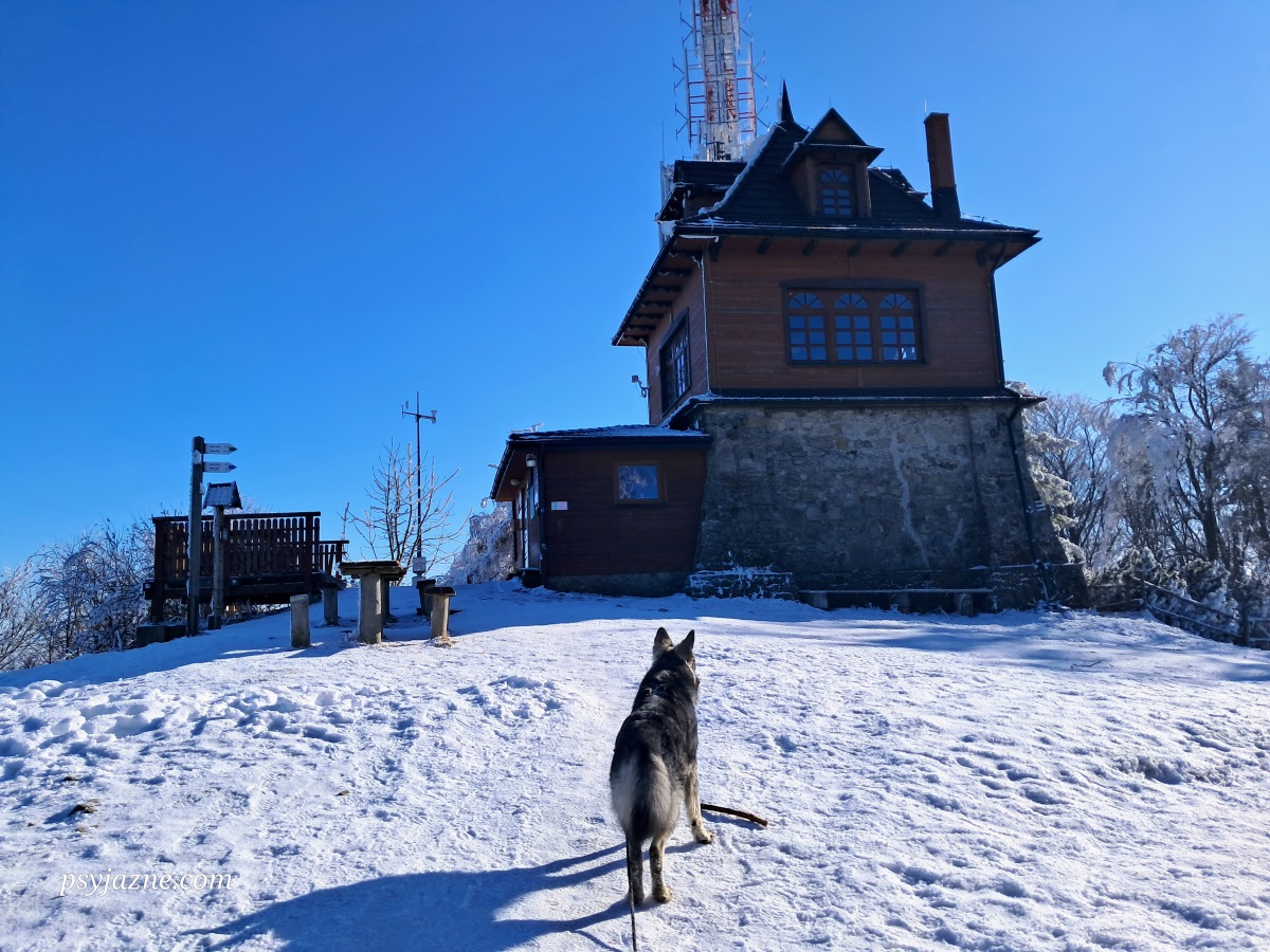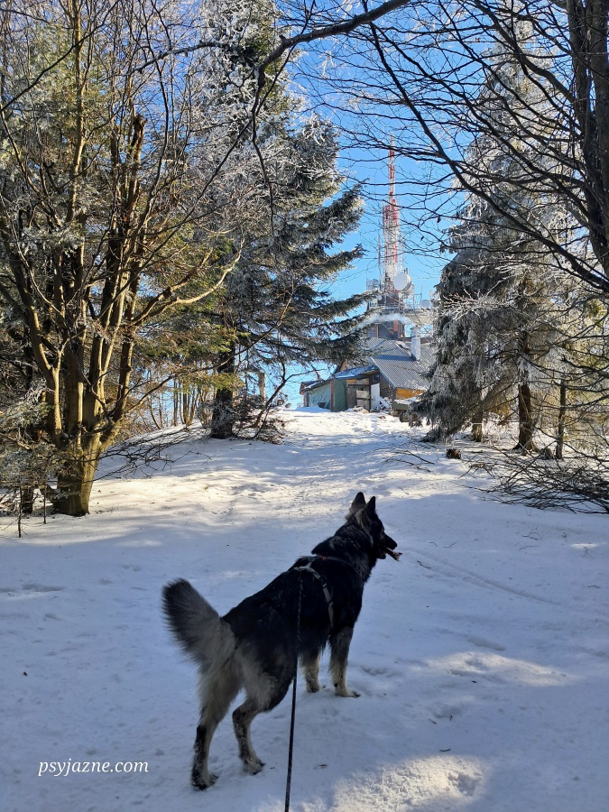 Po prawie 2,5 h marszu przeplatanego wspomnieniami książek czytanych w dzieciństwie, poznawania nowych miejsc i oczywiście zabawie z Hugo docieram na szczyt. Dopiero też tutaj spotykam pierwszych turystów wychodzących ze schroniska.