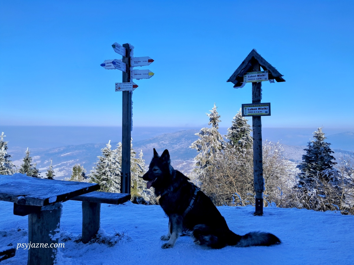 Dzisiejszy spacer pozwolił mi zdobyć Luboń Wielki z Hugo każdym szlakiem, którym można podążać z psem. W ubiegłym roku zrobiliśmy pętelkę zielono-niebieskim szlakiem z Rabki-Zaryte oraz dwukrotnie czerwonym z Przełęczy Glisne, przy czym drugi raz gdy finiszowaliśmy Mały Szlak Beskidzki, oczywiście z Hugo.