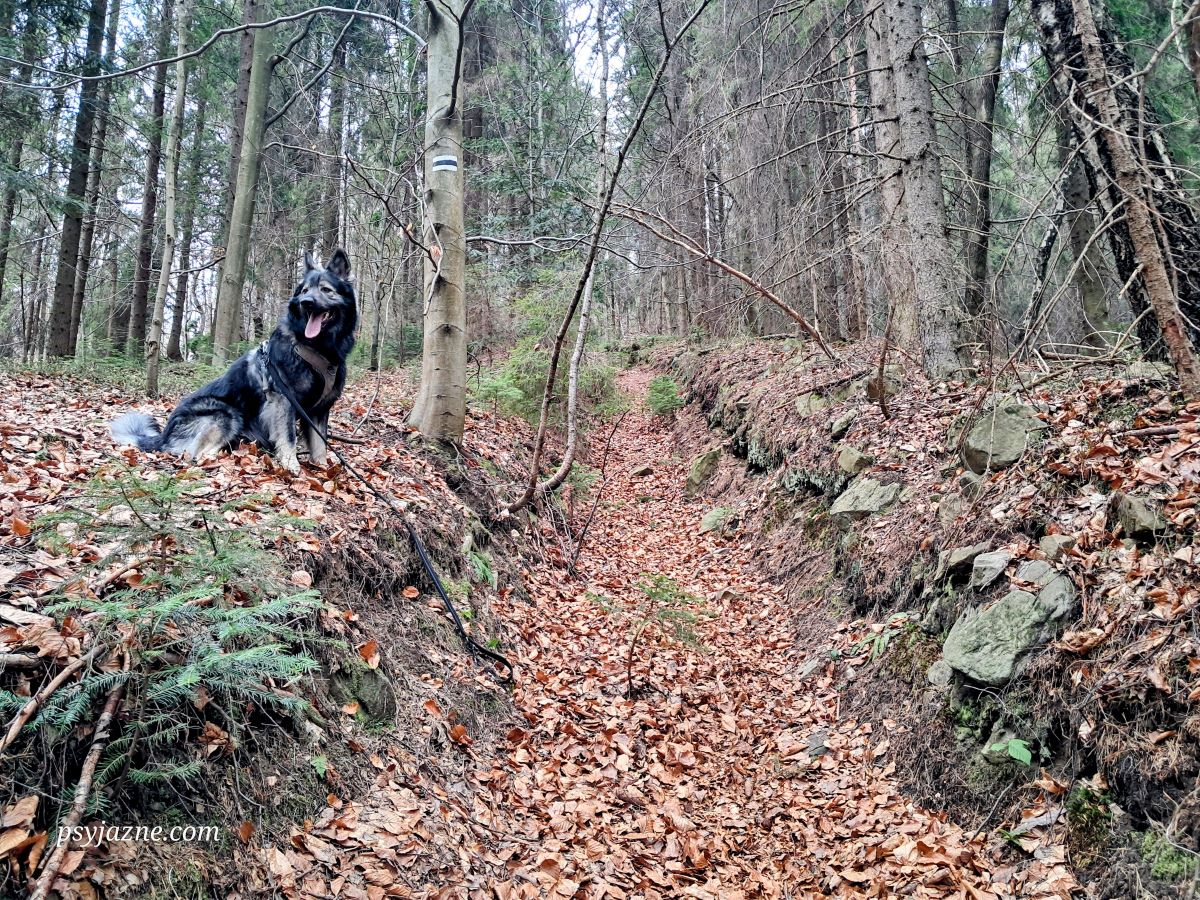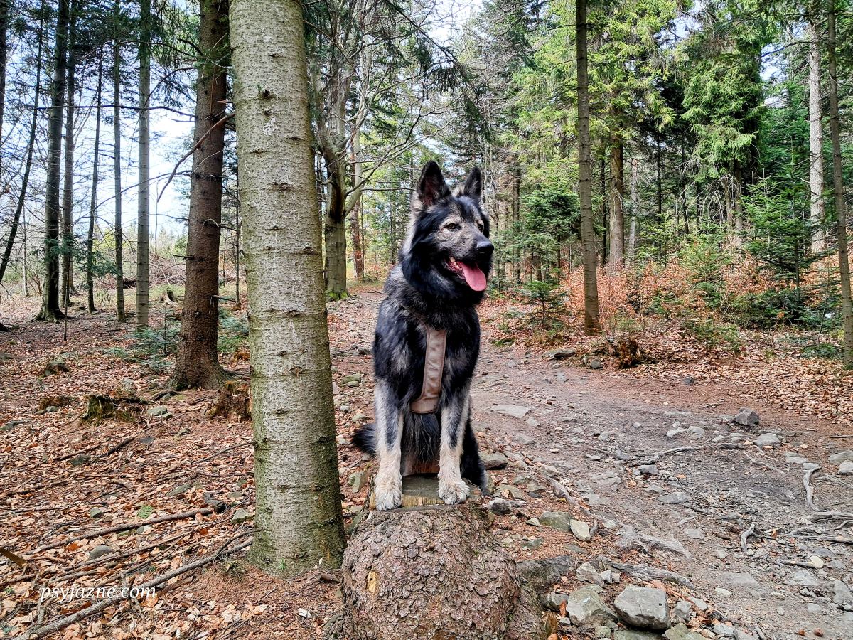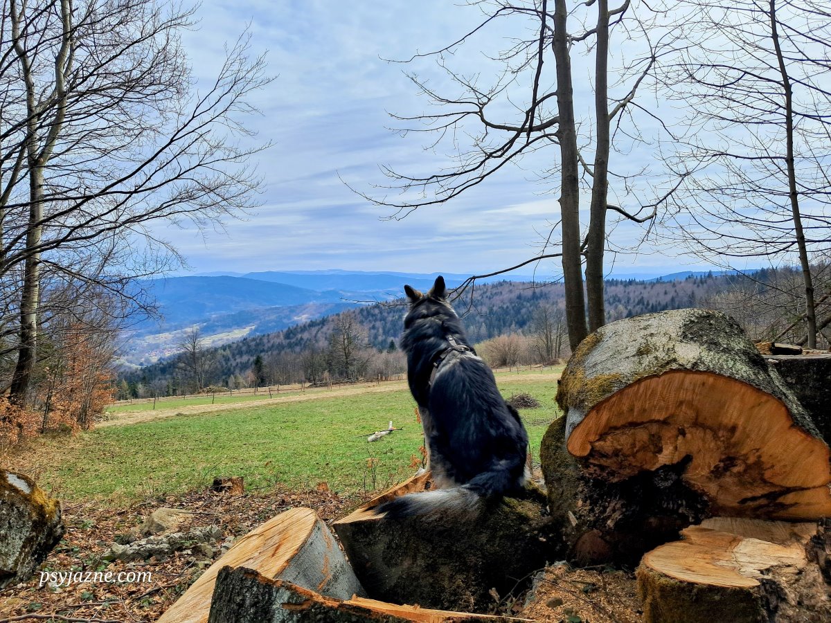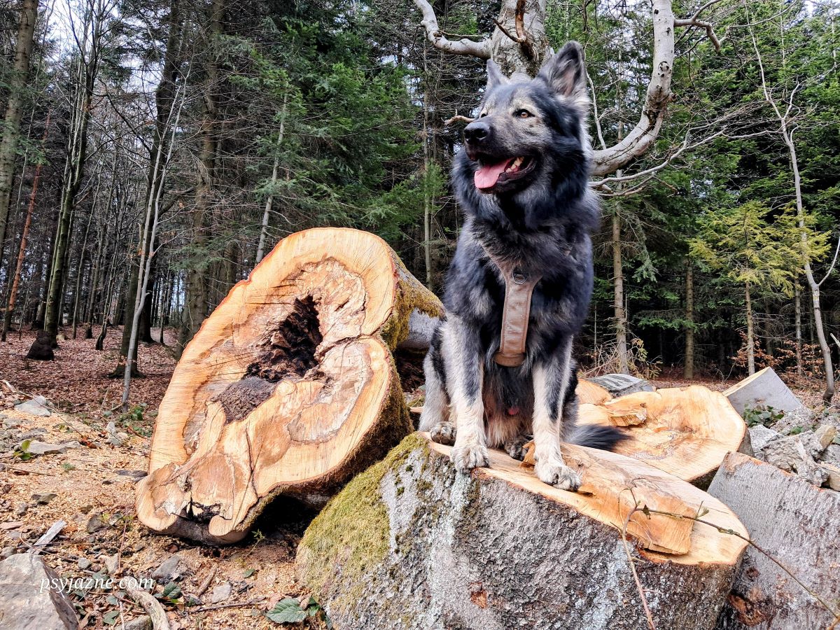 Idziemy zalesionym grzbietem Parszywki w stronę Więciórki Polany, wykorzystując pnie ściętych drzew na trening podstawowych komend posłuszeństwa. Hugo, jak każdy owczarek, poza sporą dawką ruchu potrzebuje regularnych ćwiczeń nagradzanych zabawą.