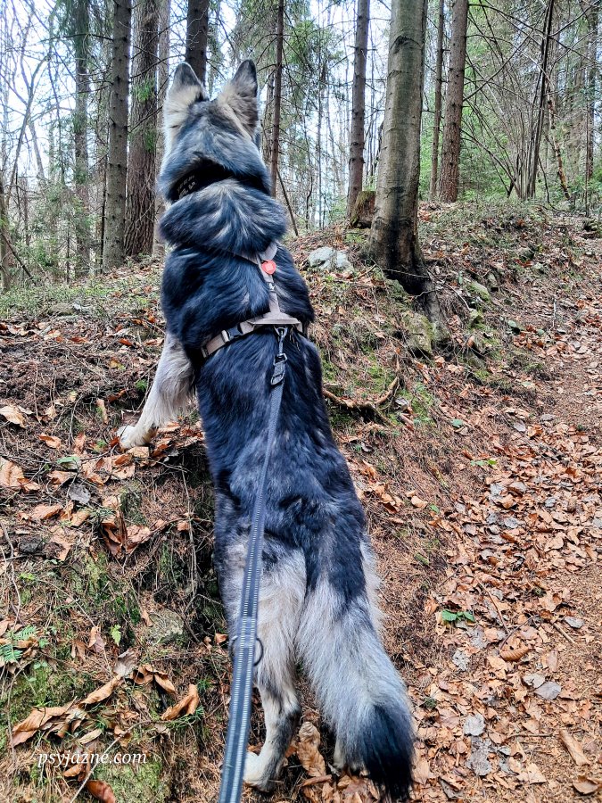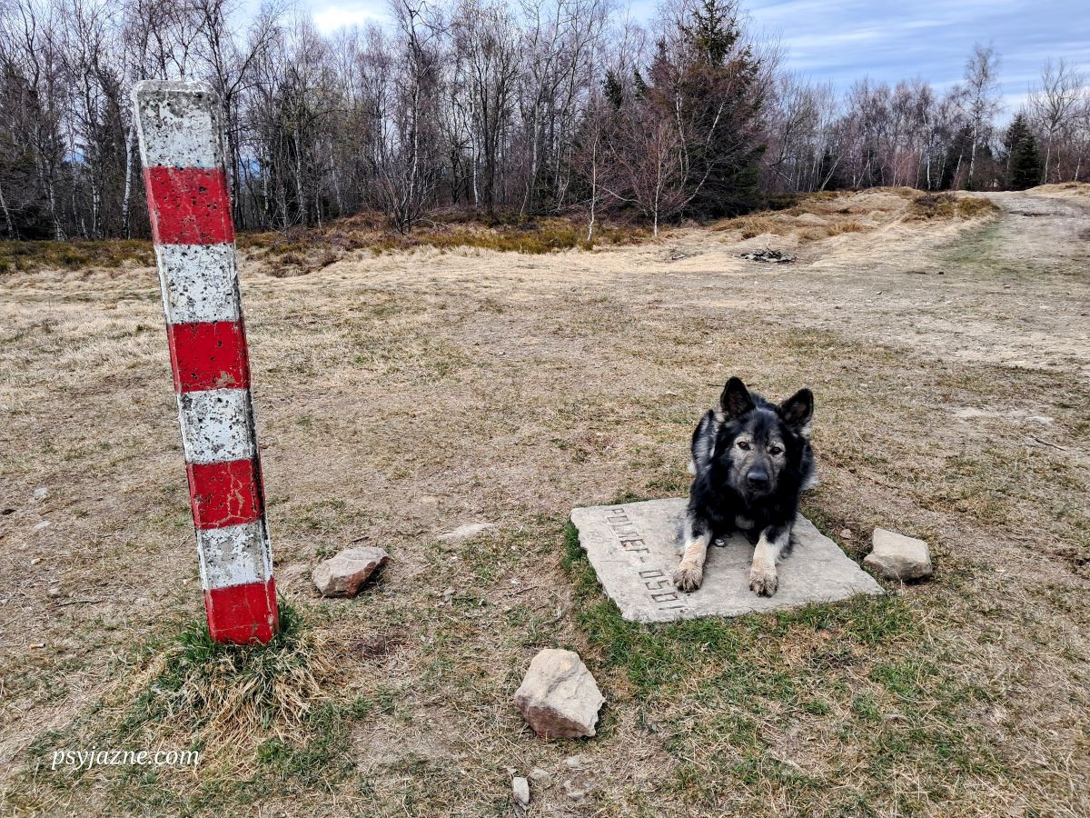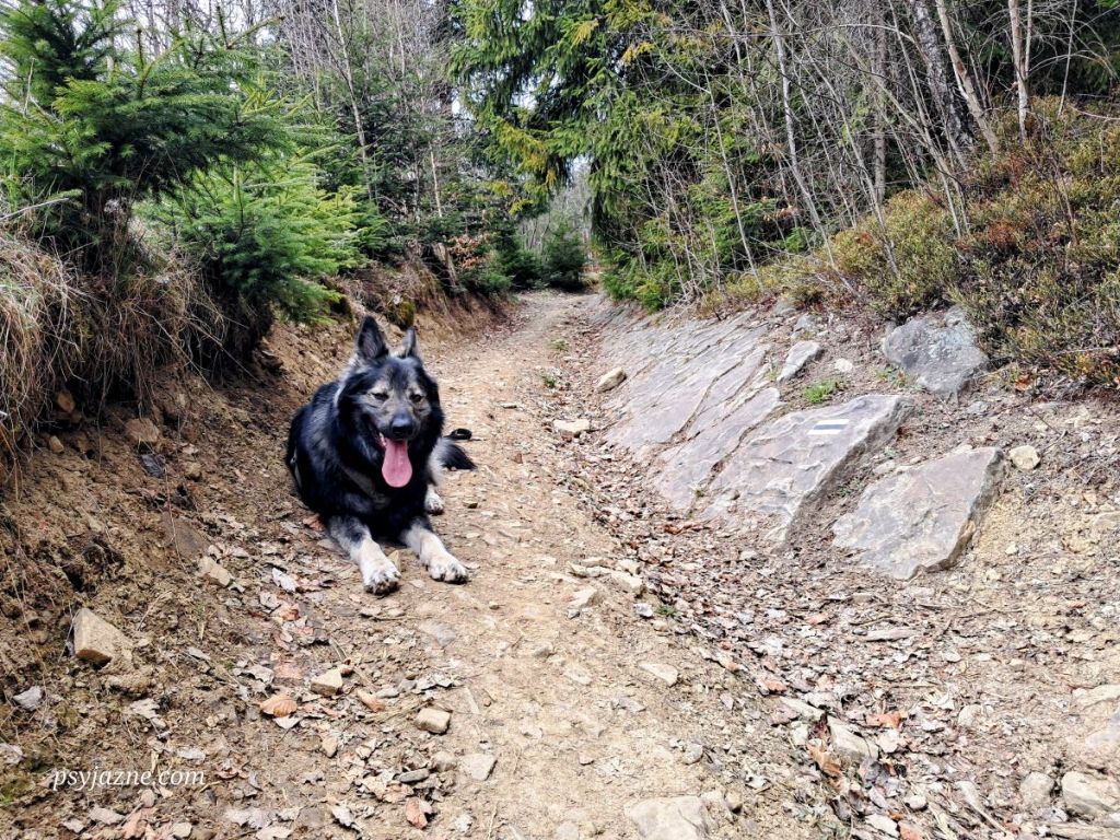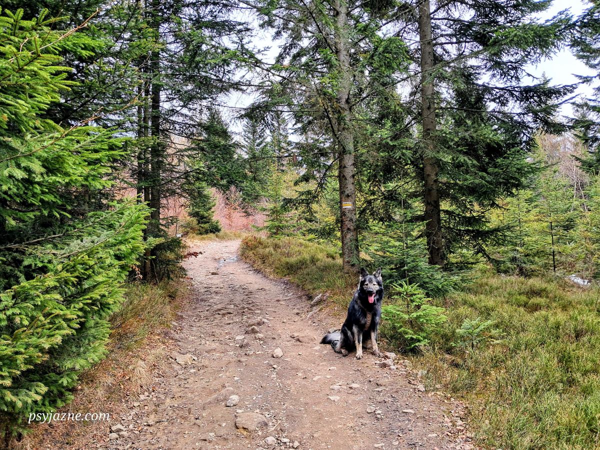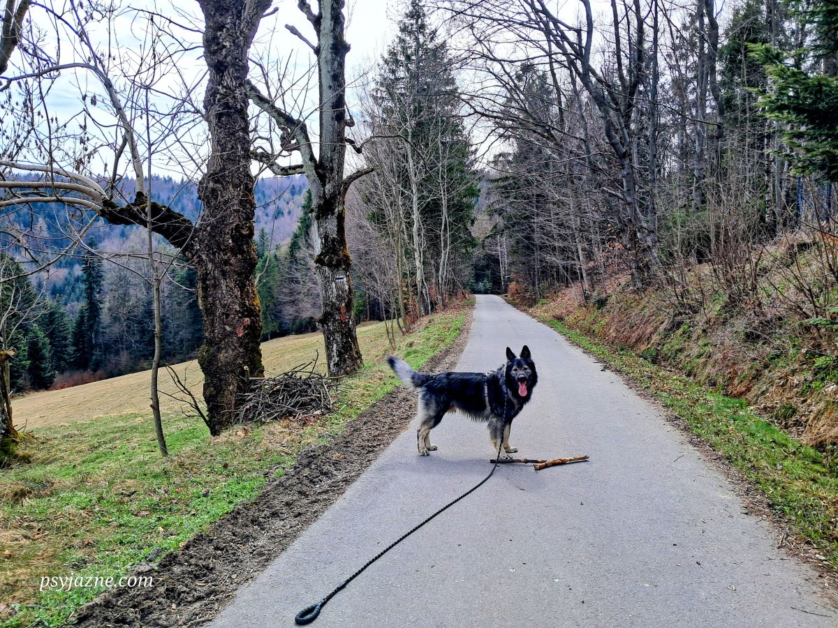 Idziemy zalesionym grzbietem Parszywki w stronę Więciórki Polany, wykorzystując pnie ściętych drzew na trening podstawowych komend posłuszeństwa. Hugo, jak każdy owczarek, poza sporą dawką ruchu potrzebuje regularnych ćwiczeń nagradzanych zabawą.