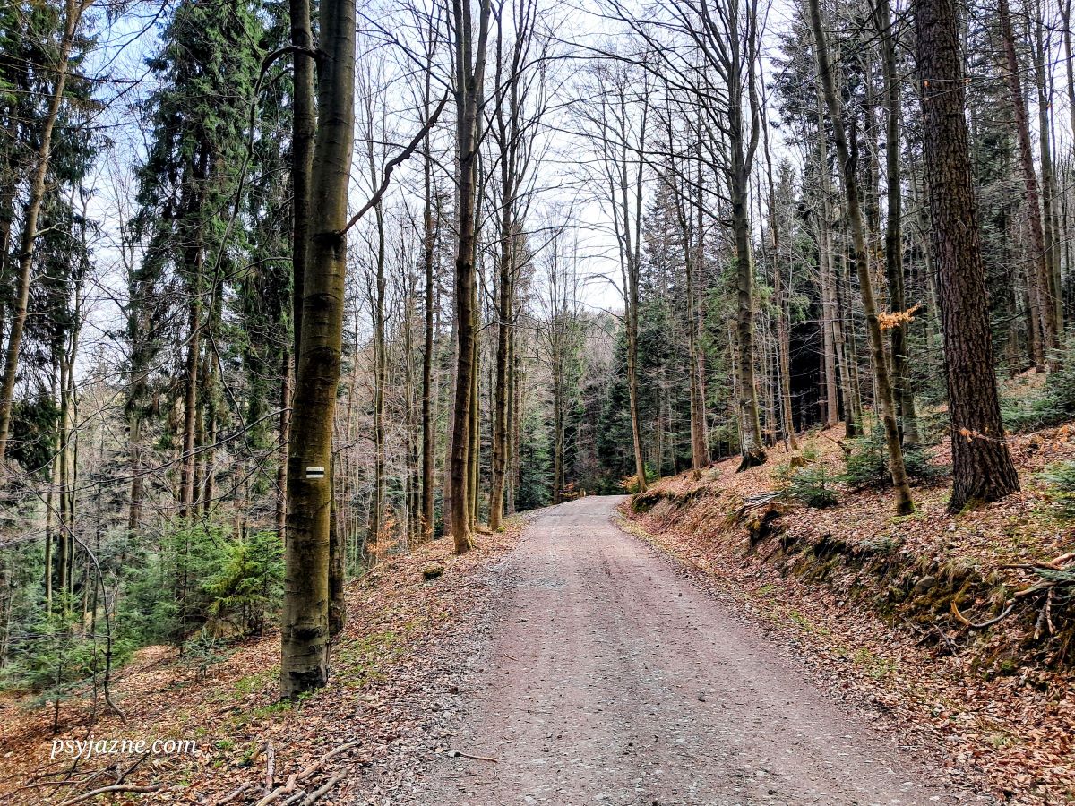 Przed nami czterokilometrowe zejście na parking do Bogdanówki. Trochę mi nie w smak, że szlak prowadzi asfaltem, ale po kilkudziesięciu metrach ten się kończy i tuptamy leśną drogą.