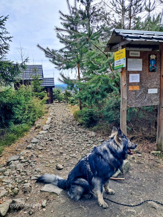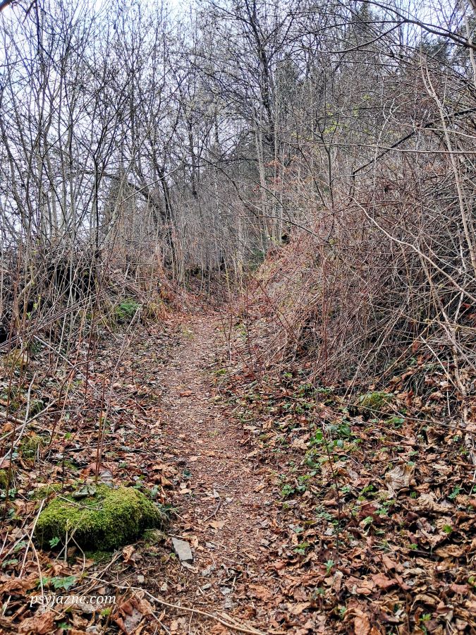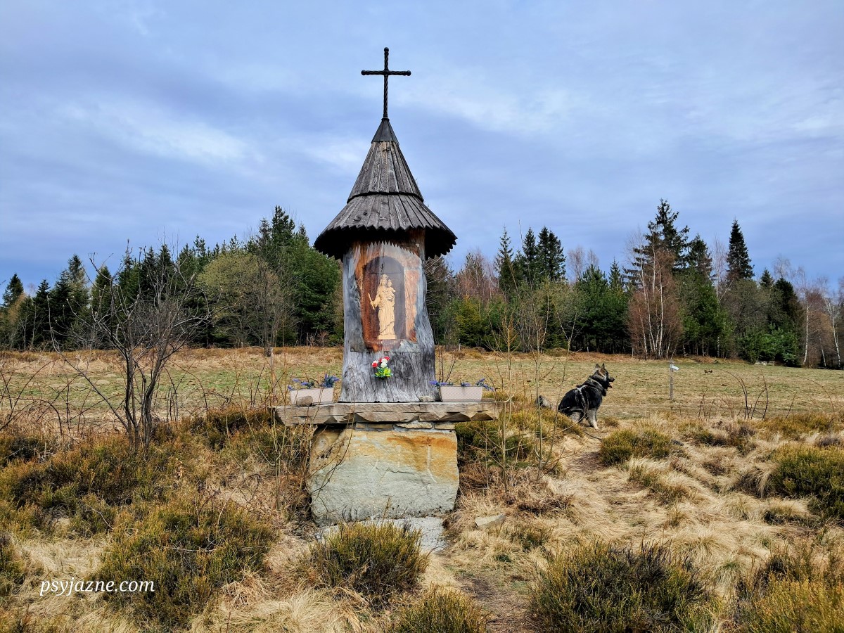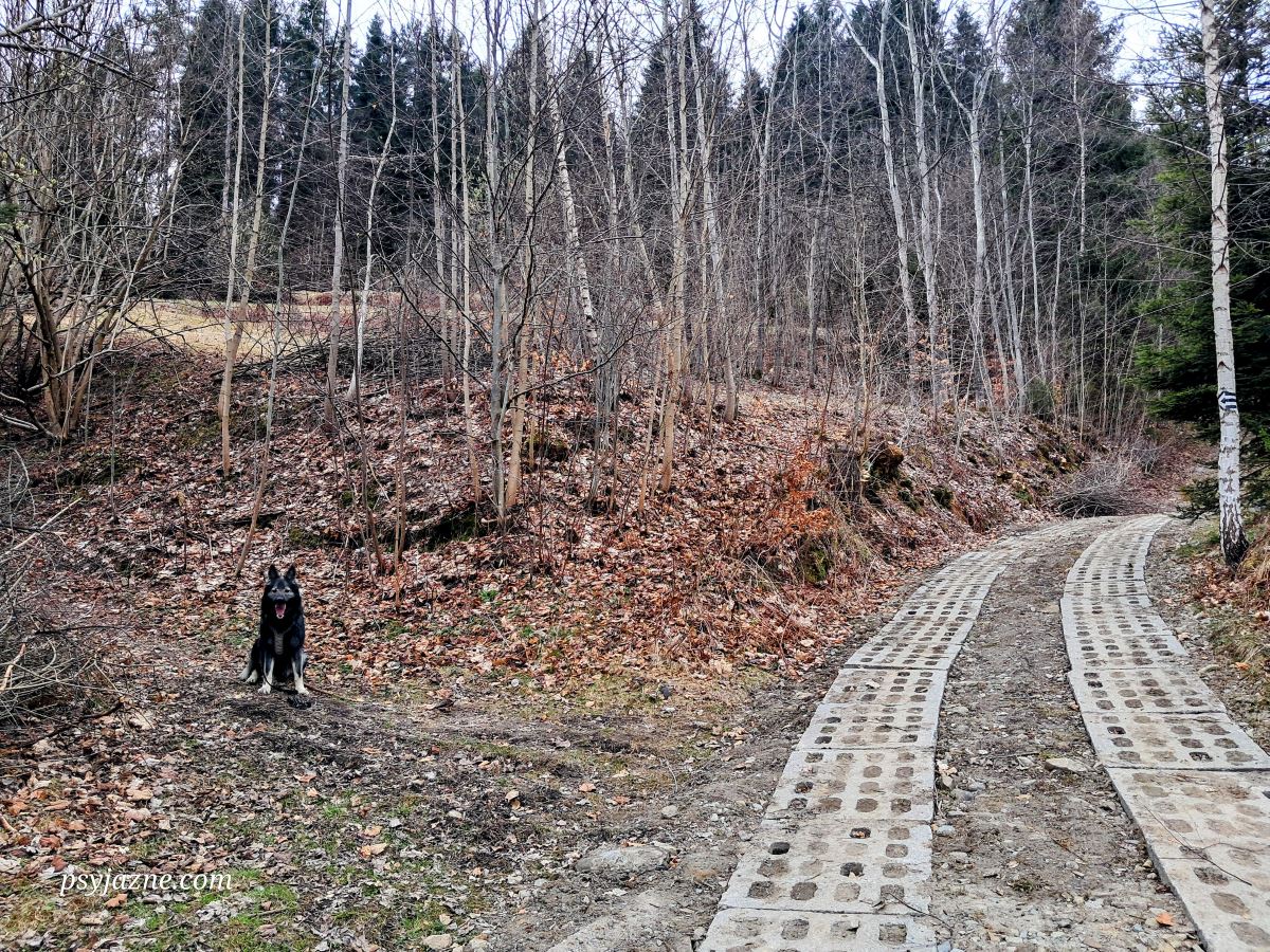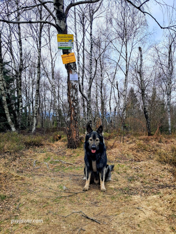 Z kapliczki pod Koskową Górą, trochę zmarznięta, ruszam z Hugo dziarskim krokiem żółtym szlakiem na Parszywkę – szczyt we wschodniej części Pasma Koskowej Góry. Na szczęście po chwili ścieżka wchodzi w las, co pozwala przez moment zapomnieć o zimnym wietrze.