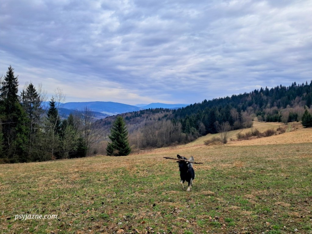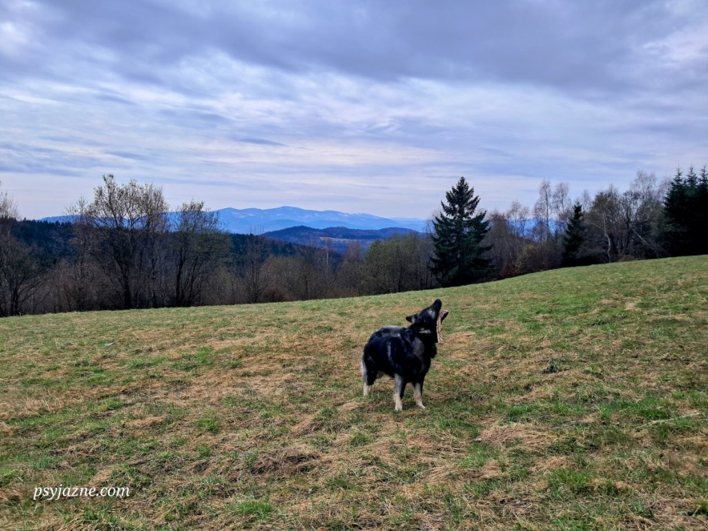 Wychodzimy z lasu i stajemy na skraju dużych pastwisk i pól uprawnych, skąd rozpościera się widok na Beskid Wyspowy, z charakterystycznym masywem Lubonia Wielkiego. Ku radości Huga, wykorzystujemy również to miejsce do aportowania patyka.