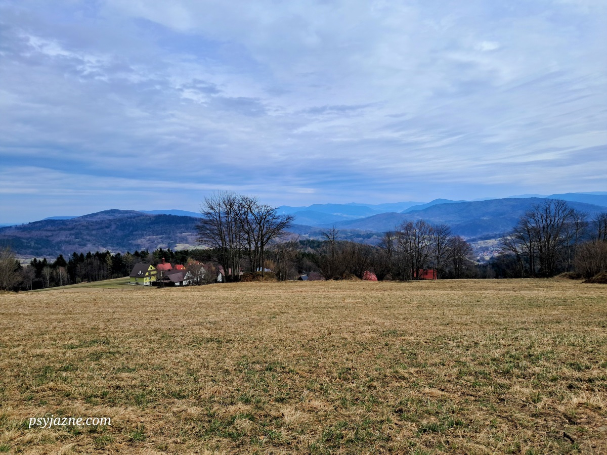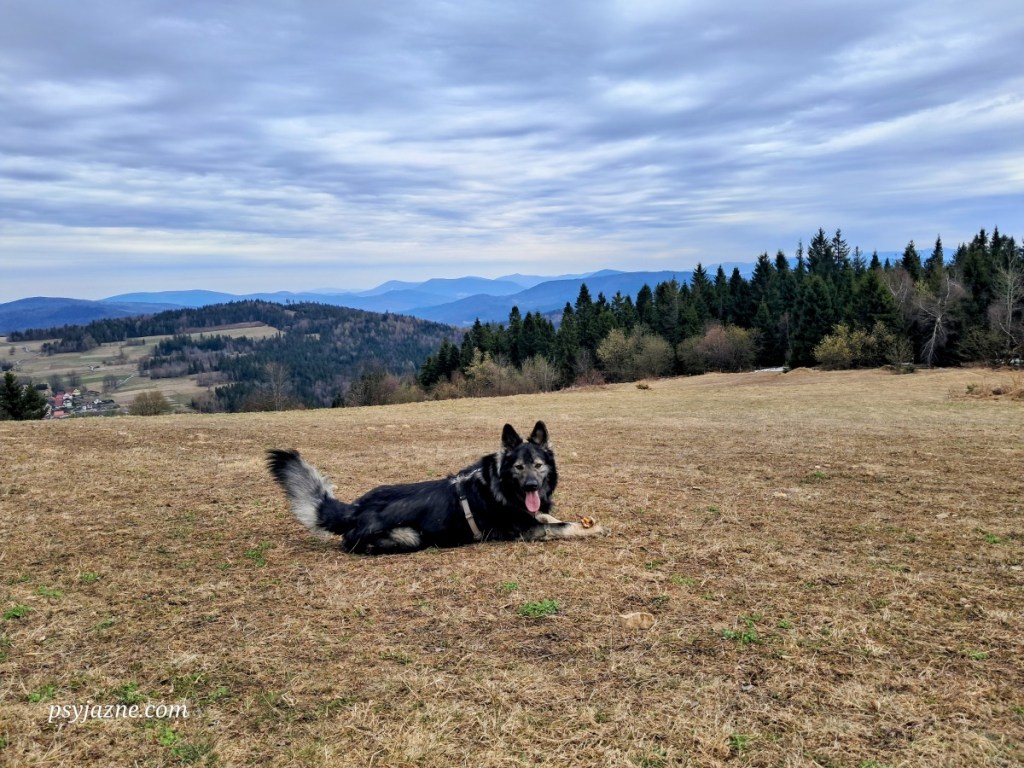 Przechodzę z Hugo kawałek dalej, skąd widać jak na dłoni najwyższe szczyty Beskidu Wyspowego.