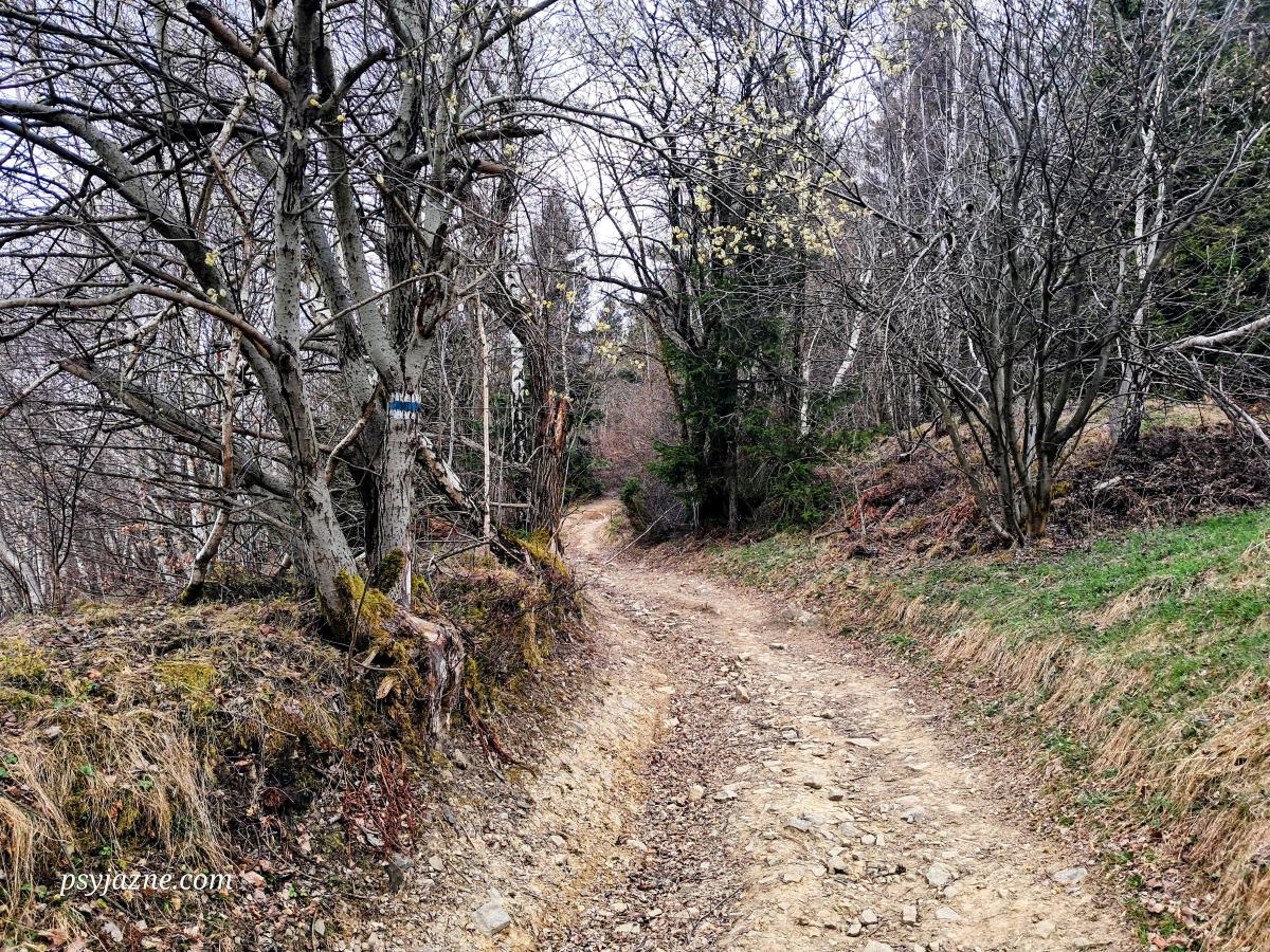 Wśród coraz wyraźniejszych ptasich treli schodzę dziarsko ciesząc się tym, co tu i teraz. Tym, że choć moje wcześniejsze plany spaliły na panewce, to jednak udało mi się pójść z Hugo na fajny, beskidzki spacer.