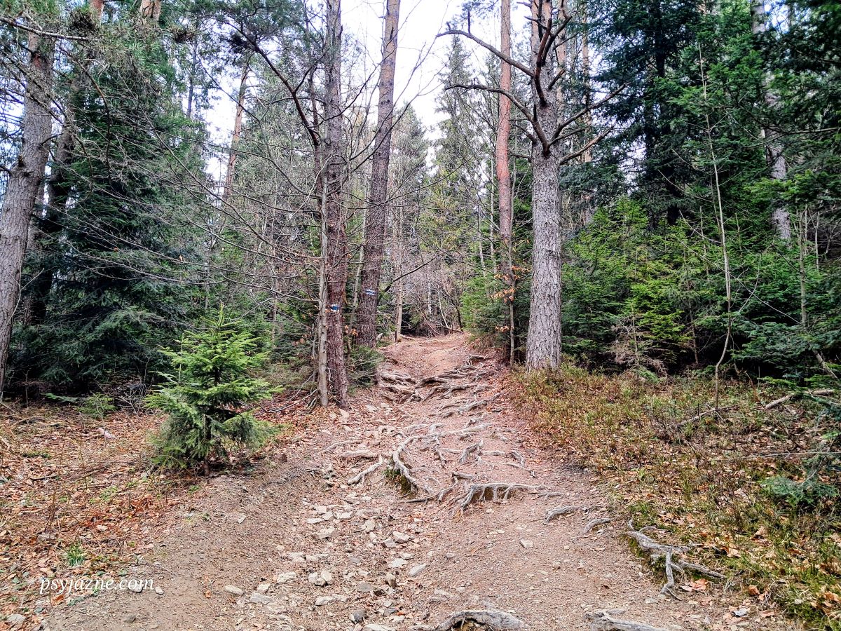 Szlak niebieski omija szczyt Koskowej Góry, ale mniej więcej po przejściu nim 1000 m, po lewej stronie znajduje się ścieżka, na którą skręcamy, by na szczyt wejść.