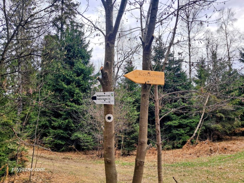Po przejściu 1300 m z parkingu w Bogdanówce dochodzimy Pod Koskową Górę, gdzie czarny szlak, którym szliśmy dotychczas kończy się i przechodzi w kolor niebieski. Znajduje się tu również drewniana tabliczka wskazująca drogę na Koskową Górę.