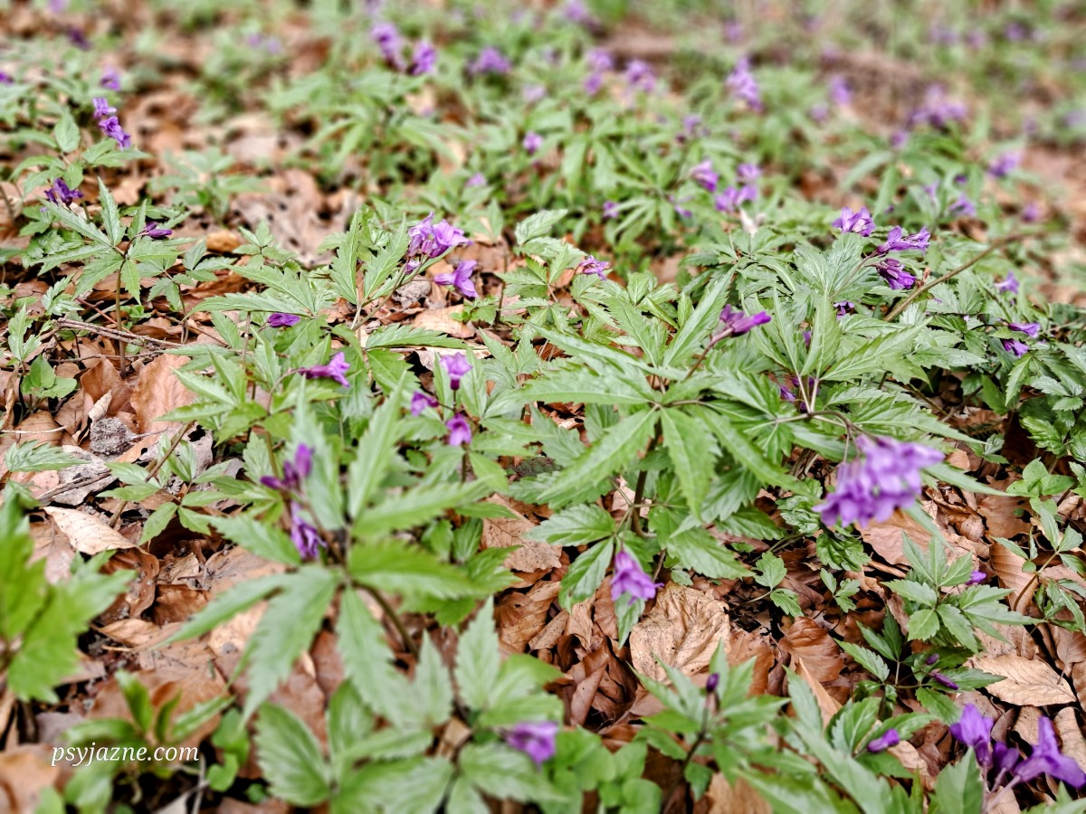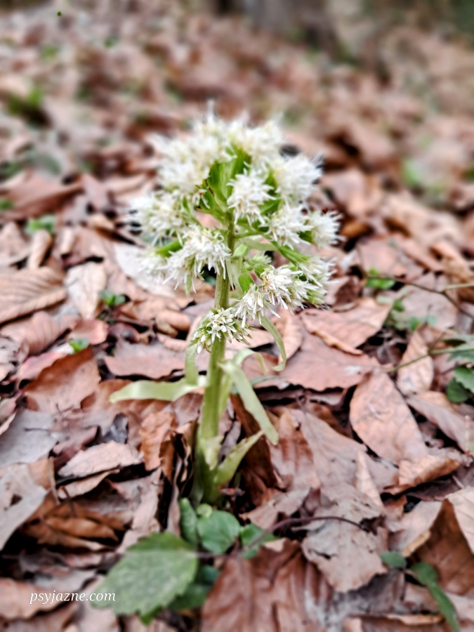 Dopiero tutaj też spotykam pierwsze ślady wiosny. Kwitnącą rzeżuchę pięciolistną i dziki rabarbar.