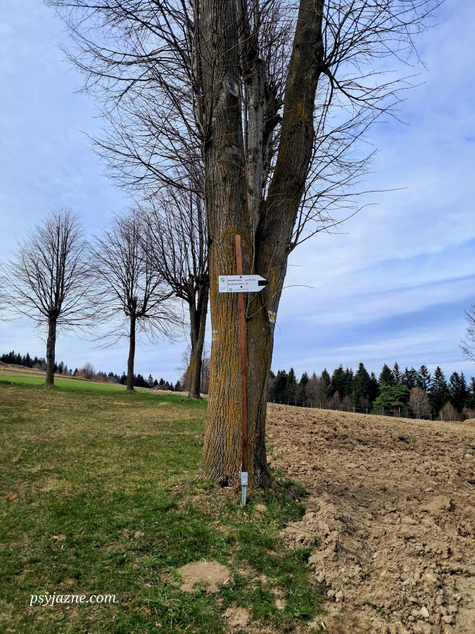 Przebiega tędy czarny szlak, który mnie interesuje i którym kieruję się na zachód. Po przejściu 0,5 km wzdłuż głównej drogi, delikatnie skręcam w lewo, mijam kilka domów, zza ogrodzeń których obszczekują Huga niezadowolone z jego obecności psy. W tym jeden, o imieniu Guliwer, co nie ukrywam wywołuje uśmiech na mojej twarzy🙂