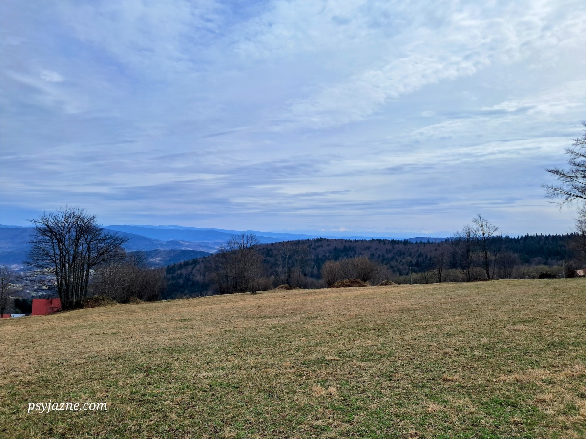 Szlakiem niebieskim, na którym się znajdujemy można praktycznie przejść cały Beskid Makowski z południa na północ, zaczynając w Jordanowie, a kończąc w Harbutowicach. Na dzisiejszym spacerze przejdziemy nim raptem niewiele ponad 2 km, ale już po kilkunastu metrach wychodzimy na kolejną łąkę, z której roztacza się widok na Beskid Żywiecki z zaśnieżonym masywem Babiej Góry, który z uwagi na zachmurzone niebo trzeba sobie raczej wyobrazić…